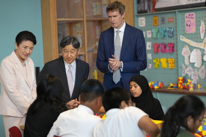 Japans Emperor Naruhito and Empress Masako with the V&A Museum Director Tristram Hunt watch children from Cayley Primary School in an origami making session at the Young V&A Museum in Bethnal Green in London, Thursday, June 27, 2024. NO UK USE FOR 48 HO