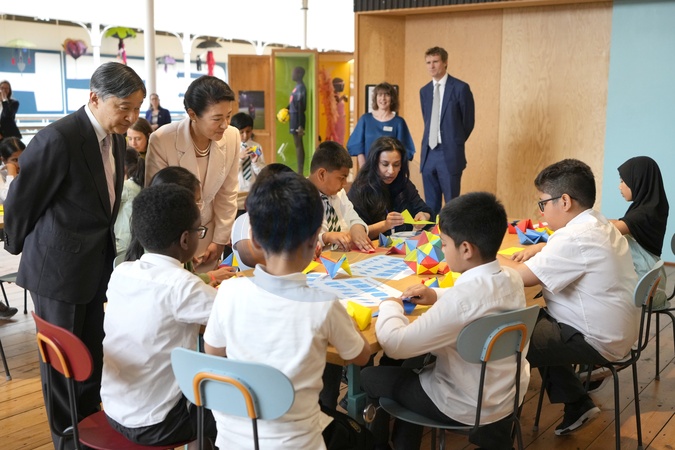 Japans Emperor Naruhito and Empress Masako watch children from Cayley Primary School in an origami making session at the Young V&A Museum in Bethnal Green in London, Thursday, June 27, 2024. NO UK USE FOR 48 HOURS