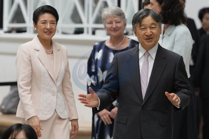 Japans Emperor Naruhito and Empress Masako react as they watch a part performance of Joe Hisaishi's award winning production of Studio Ghibi's My Neighbour Totoro, including the 'Soot Sprite Song" at the Young V&A Museum in Bethnal Green in London, Thurs
