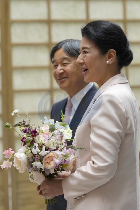 Japans Emperor Naruhito and Empress Masako receive a posey as they depart following a visit to the Young V&A Museum in Bethnal Green in London, Thursday, June 27, 2024. NO UK USE FOR 48 HOURS, Credit:Avalon.red / Avalon