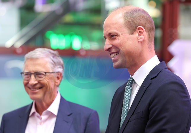 Bill Gates, founder of Breakthrough Energy and Prince William, Prince of Wales wearing a recycled tie laughing during a tour of the Innovation Showcase at the Breakthrough Energy Summit on June 27, 2024 in London, England. The Breakthrough Energy Summit brings together leaders in technology, policy, science, academia, and business to collaborate on innovative climate solutions. Over 1,200 participants are expected to attend the 2024 Summit. NO UK USE FOR 48 HOURS, Credit:Avalon.red / Avalon