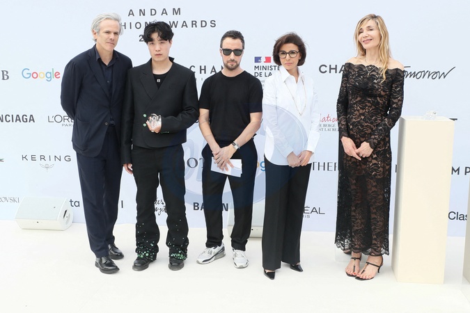 Semi-exclusif - Guillaume Houzé, Edmond Luu (Prix Pierre Bergé), Anthony Vaccarello, Rachida Dati, Nathalie Dufour - 35ème édition des "Trophées ANDAM" dans les jardins du Palais Royal à Paris, France, le 27 juin 2024. © Christophe Clovis / Bestimage Semi Exclusive 35th ANDAM Awards in the gardens of the Palais Royal in Paris on june 27 2024