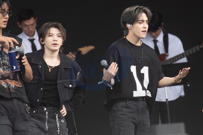 (L-R) - Woozi and S.Coups (Choi Seung-cheol) of South Korean K-Pop band Seventeen performs on The Pyramid Stage at Glastonbury Festival 2024 at Worthy Farm, Pilton in Glastonbury, England, UK on Friday 28 June 2024., Credit:Justin Ng / Avalon