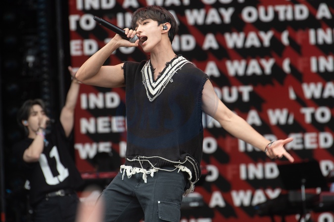 Dokyeom of South Korean K-Pop band Seventeen performs on The Pyramid Stage at Glastonbury Festival 2024 at Worthy Farm, Pilton in Glastonbury, England, UK on Friday 28 June 2024., Credit:Justin Ng / Avalon