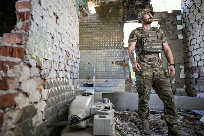 DONETSK REGION, UKRAINE - JUNE 13, 2024 - An aerial reconnaissance man of the 148th separate artillery brigade of the Ukrainian Air Assault Forces is pictured by a disassembled drone, Donetsk region, eastern Ukraine, Credit:Dmytro Smolienko / Avalon
