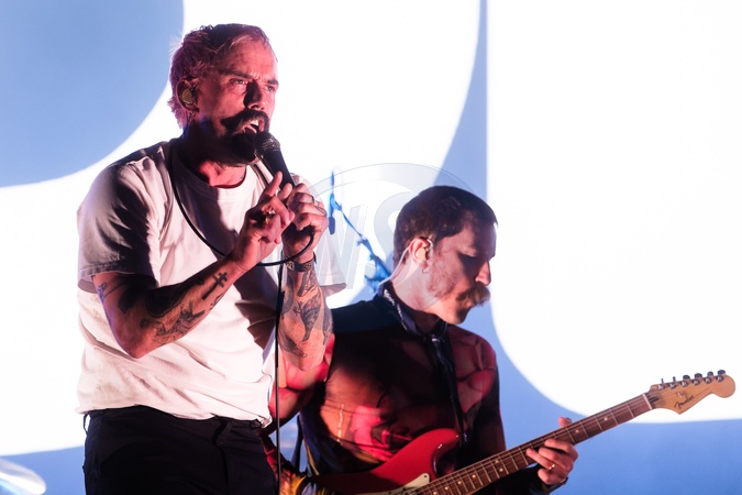 Joe Talbot and Mark Bowen of Bristol band IDLES as the band headlines the Other Stage on the Friday night during 2024 Glastonbury Festival on Friday 28 June 2024 at Worthy Farm, Glastonbury. ., Credit:Julie Edwards / Avalon