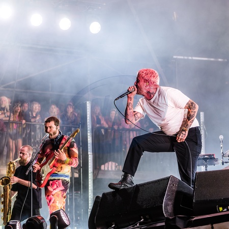Joe Talbot of Bristol band IDLES as the band headlines the Other Stage on the Friday night during 2024 Glastonbury Festival on Friday 28 June 2024 at Worthy Farm, Glastonbury. ., Credit:Julie Edwards / Avalon