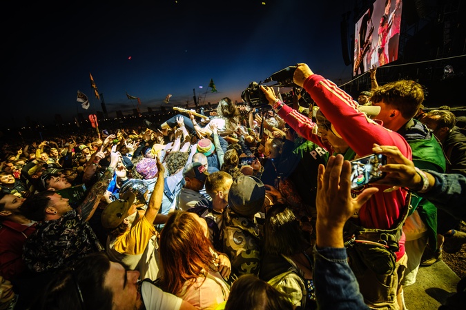 Lee Kiernan of IDLES crowdsurfs as the band headlines the other stage on the Friday night during 2024 Glastonbury Festival on Friday 28 June 2024 at Worthy Farm, Glastonbury. ., Credit:Julie Edwards / Avalon