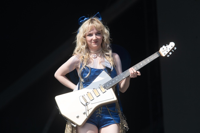 Lead guitarist Emily Roberts of English indie band The Last Dinner Party performs on the Other Stage at Glastonbury Festival 2024 Saturday at Worthy Farm, Pilton in Glastonbury, England, UK on Saturday 29 June 2024., Credit:Justin Ng / Avalon