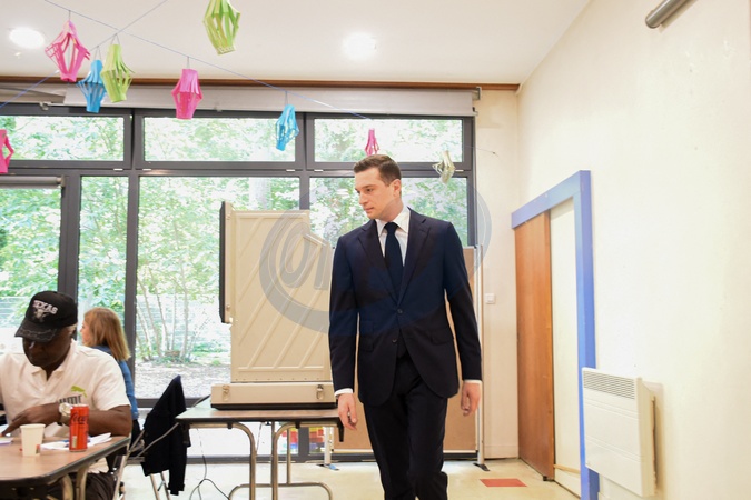 Le président du parti d'extrême droite Rassemblement national (RN) et député européen Jordan Bardella vote pour le premier tour des législatives à Garches banlieue de Paris, France, le 30 juin 2024. © Florian Poitout/Bestimage Jordan Bardella, voting in the hauts de seines in Garches as part of the first round of legislative elections, following the dissolution of the national assembly by French President, in Garches (suburb of Paris), France, on June 30, 2024.