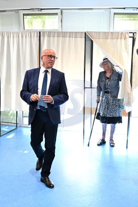 Eric Ciotti, le député de la 1ere circonscription des Alpes-Maritimes et président controversé des LR rallié au RN, a voté à Nice, à l'école des Baumettes, pour le 1er tour des élections législatives, le 30 juin 2024. © Bruno Bebert/Bestimage President of the Republicans (LR) Eric Ciotti votes in the first round of legislative elections in Nice, France, June 30, 2024.