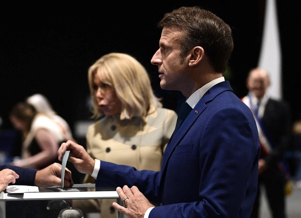 Prezydent Republiki Emmanuelle Macron i jego żona, Pierwsza Dama Brigitte Macron, głosują w pierwszej turze wyborów legislacyjnych w Salle des Quatre Saisons w Le Touquet