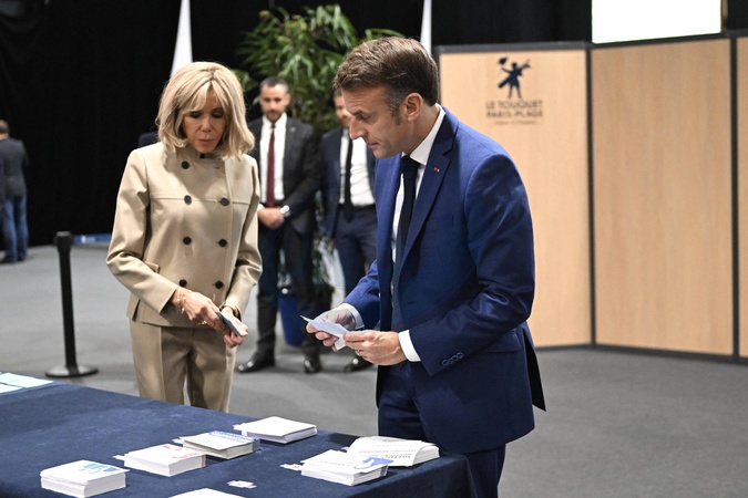 Prezydent Republiki Emmanuelle Macron i jego żona, Pierwsza Dama Brigitte Macron, głosują w pierwszej turze wyborów legislacyjnych w Salle des Quatre Saisons w Le Touquet