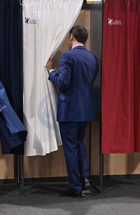 Le président de la République Emmanuelle Macron vote pour le premier tour des législatives à la salle des Quatre Saisons au Touquet, France, le 30 juin 2024. © Jeanne Accorsini/Pool/Bestimage French President Emmanuelle Macron votes for the first round of legislative elections at the Salle des Quatre Saisons in Le Touquet, France, on June 30, 2024.