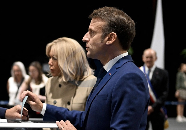 Prezydent Republiki Emmanuelle Macron i jego żona, Pierwsza Dama Brigitte Macron, głosują w pierwszej turze wyborów legislacyjnych w Salle des Quatre Saisons w Le Touquet