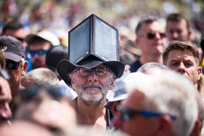 An energy conscious festival goer wearing a Hat with Solar Panels seen performing on the atmosphere on the Sunday of 2024 Glastonbury Festival held at Worthy Farm in Glastonbury, UK on 30 Jun , 2024., Credit:Julie Edwards / Avalon