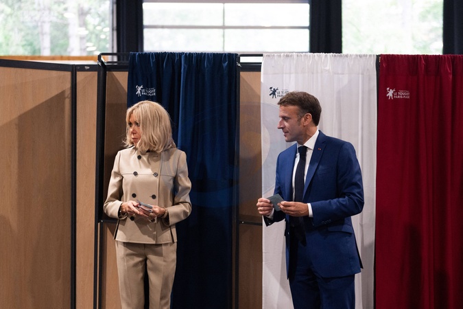 Prezydent Republiki Emmanuel Macron i jego żona, Pierwsza Dama Brigitte Macron, głosują w pierwszej turze wyborów legislacyjnych w Salle des Quatre Saisons w Le Touquet
