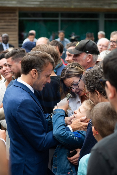 Le président Emmanuel Macron lors du vote pour le premier tour des élections législatives à la salle des Quatre Saisons au Touquet le 30 juin 2024 © Jeanne Accorsini / Pool / Bestimage French President Emmanuel Macron arrives in the polling station of le Touqet Paris Plage for the first round of early legislative elections. Crowd bath and selfie for the president with Le touquet people. Salle des Quatre Saisons, polling station in Le Touquet Paris Plage, northern France, Sunday June 30, 2024.//ACCORSINIJEANNE_VOTE.0030/Credit:JEANNE ACCORSINI/SIPA/2406301629