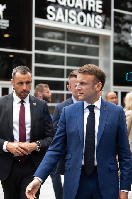 Le président Emmanuel Macron lors du vote pour le premier tour des élections législatives à la salle des Quatre Saisons au Touquet le 30 juin 2024 © Jeanne Accorsini / Pool / Bestimage French President Emmanuel Macron arrives in the polling station of le Touqet Paris Plage for the first round of early legislative elections. Crowd bath and selfie for the president with Le touquet people. Salle des Quatre Saisons, polling station in Le Touquet Paris Plage, northern France, Sunday June 30, 2024.//ACCORSINIJEANNE_VOTE.0032/Credit:JEANNE ACCORSINI/SIPA/2406301631