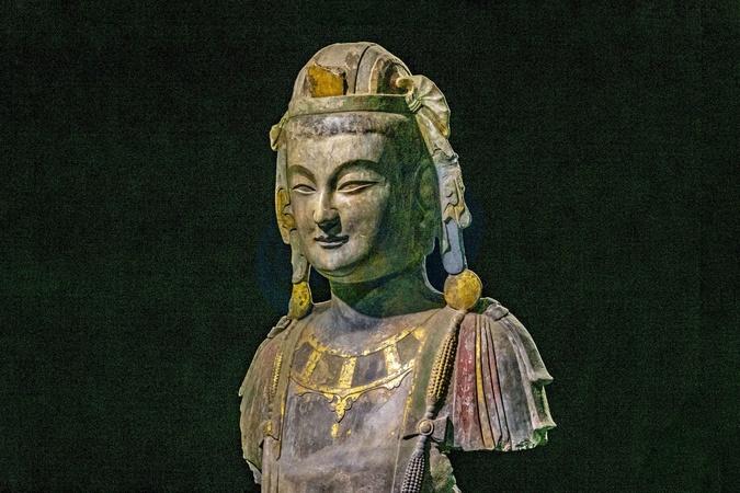 A gilded and colorfully painted stone carving of a standing Bodhisattva statue made in the sixth century at a museum in Qingzhou city in east China's Shandong province Thursday, July 18, 2019. The armless goddess statue was discovered in 1996, and was dubbed by some as the Venus of the Orient., Credit:FEATURECHINA / Avalon