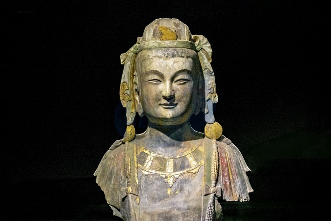 A gilded and colorfully painted stone carving of a standing Bodhisattva statue made in the sixth century at a museum in Qingzhou city in east China's Shandong province Thursday, July 18, 2019. The armless goddess statue was discovered in 1996, and was dubbed by some as the Venus of the Orient., Credit:FEATURECHINA / Avalon