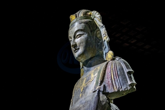 A gilded and colorfully painted stone carving of a standing Bodhisattva statue made in the sixth century at a museum in Qingzhou city in east China's Shandong province Thursday, July 18, 2019. The armless goddess statue was discovered in 1996, and was dubbed by some as the Venus of the Orient., Credit:FEATURECHINA / Avalon