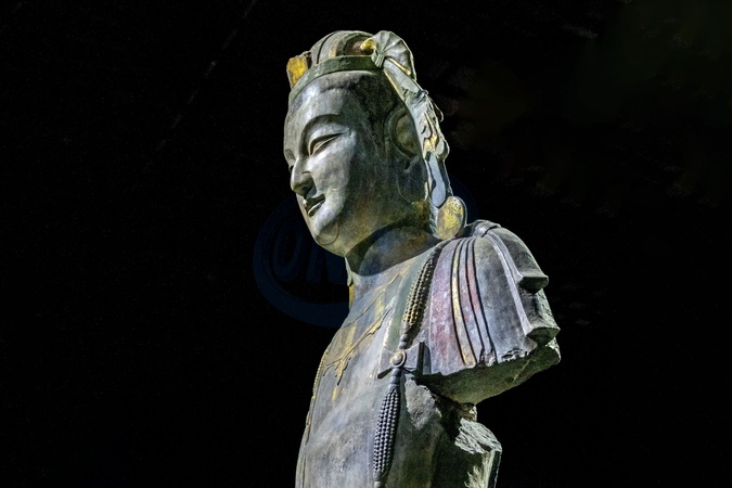 A gilded and colorfully painted stone carving of a standing Bodhisattva statue made in the sixth century at a museum in Qingzhou city in east China's Shandong province Thursday, July 18, 2019. The armless goddess statue was discovered in 1996, and was dubbed by some as the Venus of the Orient., Credit:FEATURECHINA / Avalon