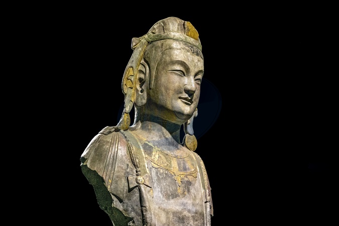 A gilded and colorfully painted stone carving of a standing Bodhisattva statue made in the sixth century at a museum in Qingzhou city in east China's Shandong province Thursday, July 18, 2019., Credit:FEATURECHINA / Avalon