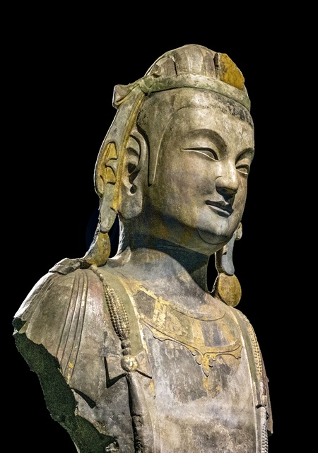 A gilded and colorfully painted stone carving of a standing Bodhisattva statue made in the sixth century at a museum in Qingzhou city in east China's Shandong province Thursday, July 18, 2019. The armless goddess statue was discovered in 1996, and was dubbed by some as the Venus of the Orient., Credit:FEATURECHINA / Avalon