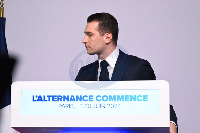 Rassemblement national (RN) et principal eurodéputé, Jordan Bardella, prononce un discours lors de la soirée de résultats du premier tour des élections législatives à Paris le 30 juin 2024. L'extrême droite française a remporté le premier tour des élections législatives cruciales du 30 juin 2024, les forces centristes du président français n'arrivant qu'en troisième position derrière la gauche après le taux de participation le plus élevé depuis plus de quatre décennies, selon les estimations. French far-right Rassemblement National (RN) political party President and lead MEP Jordan Bardella gives a speech during the results evening of the first round of the parliamentary elections in Paris on June 30, 2024. France's far right won the first round of pivotal legislative elections on June 30, 2024, with the centrist forces of France's President coming in only third behind the left after the highest turnout in over four decades, estimates said.