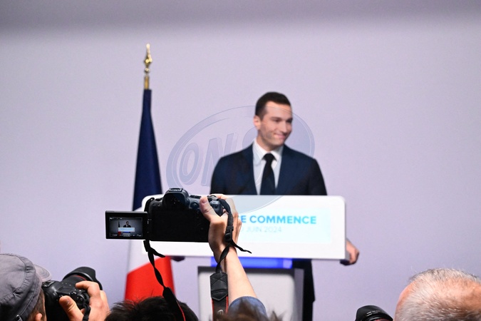 Rassemblement national (RN) et principal eurodéputé, Jordan Bardella, prononce un discours lors de la soirée de résultats du premier tour des élections législatives à Paris le 30 juin 2024. L'extrême droite française a remporté le premier tour des élections législatives cruciales du 30 juin 2024, les forces centristes du président français n'arrivant qu'en troisième position derrière la gauche après le taux de participation le plus élevé depuis plus de quatre décennies, selon les estimations. French far-right Rassemblement National (RN) political party President and lead MEP Jordan Bardella gives a speech during the results evening of the first round of the parliamentary elections in Paris on June 30, 2024. France's far right won the first round of pivotal legislative elections on June 30, 2024, with the centrist forces of France's President coming in only third behind the left after the highest turnout in over four decades, estimates said.