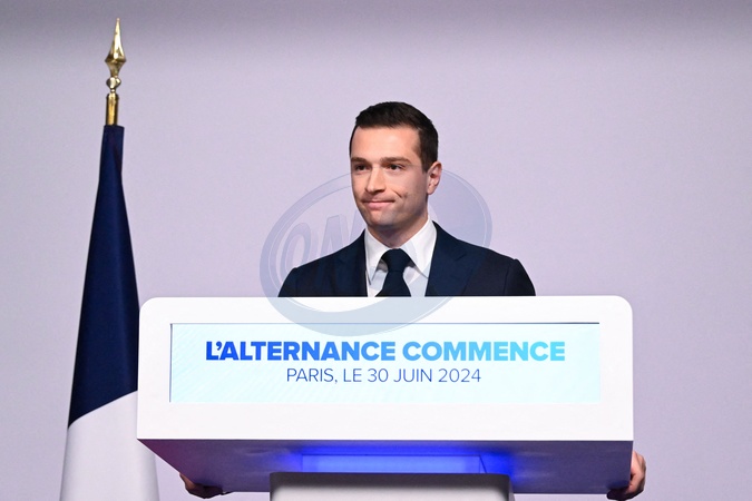 Rassemblement national (RN) et principal eurodéputé, Jordan Bardella, prononce un discours lors de la soirée de résultats du premier tour des élections législatives à Paris le 30 juin 2024. L'extrême droite française a remporté le premier tour des élections législatives cruciales du 30 juin 2024, les forces centristes du président français n'arrivant qu'en troisième position derrière la gauche après le taux de participation le plus élevé depuis plus de quatre décennies, selon les estimations. French far-right Rassemblement National (RN) political party President and lead MEP Jordan Bardella gives a speech during the results evening of the first round of the parliamentary elections in Paris on June 30, 2024. France's far right won the first round of pivotal legislative elections on June 30, 2024, with the centrist forces of France's President coming in only third behind the left after the highest turnout in over four decades, estimates said.
