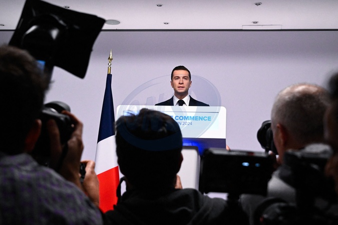Rassemblement national (RN) et principal eurodéputé, Jordan Bardella, prononce un discours lors de la soirée de résultats du premier tour des élections législatives à Paris le 30 juin 2024. L'extrême droite française a remporté le premier tour des élections législatives cruciales du 30 juin 2024, les forces centristes du président français n'arrivant qu'en troisième position derrière la gauche après le taux de participation le plus élevé depuis plus de quatre décennies, selon les estimations. French far-right Rassemblement National (RN) political party President and lead MEP Jordan Bardella gives a speech during the results evening of the first round of the parliamentary elections in Paris on June 30, 2024. France's far right won the first round of pivotal legislative elections on June 30, 2024, with the centrist forces of France's President coming in only third behind the left after the highest turnout in over four decades, estimates said.