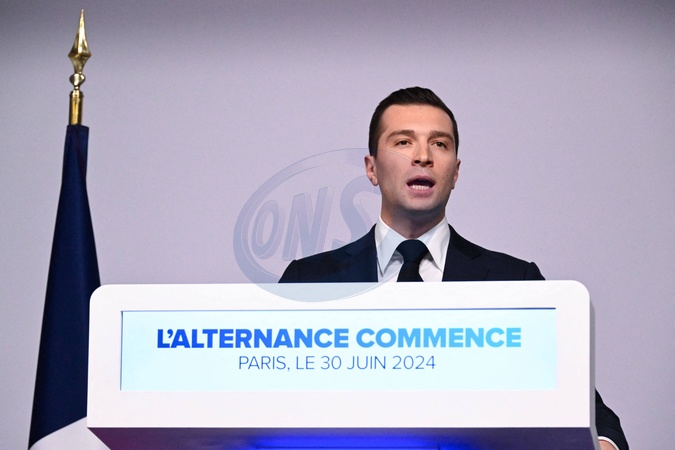 Rassemblement national (RN) et principal eurodéputé, Jordan Bardella, prononce un discours lors de la soirée de résultats du premier tour des élections législatives à Paris le 30 juin 2024. L'extrême droite française a remporté le premier tour des élections législatives cruciales du 30 juin 2024, les forces centristes du président français n'arrivant qu'en troisième position derrière la gauche après le taux de participation le plus élevé depuis plus de quatre décennies, selon les estimations. French far-right Rassemblement National (RN) political party President and lead MEP Jordan Bardella gives a speech during the results evening of the first round of the parliamentary elections in Paris on June 30, 2024. France's far right won the first round of pivotal legislative elections on June 30, 2024, with the centrist forces of France's President coming in only third behind the left after the highest turnout in over four decades, estimates said.