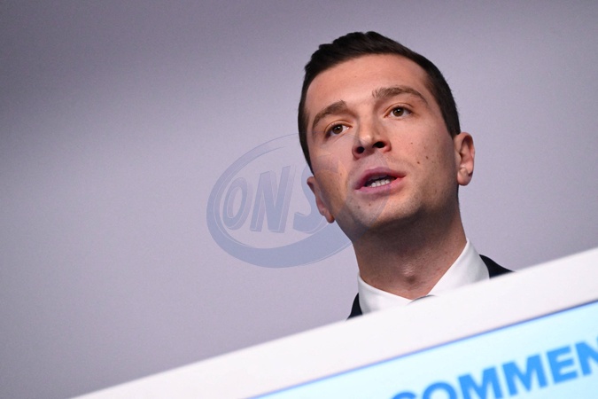 Jordan Bardella wygłasza przemówienie podczas wieczoru wyników pierwszej tury wyborów do organów legislacyjnych w Paryżu