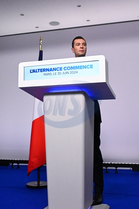 Rassemblement national (RN) et principal eurodéputé, Jordan Bardella, prononce un discours lors de la soirée de résultats du premier tour des élections législatives à Paris le 30 juin 2024. L'extrême droite française a remporté le premier tour des élections législatives cruciales du 30 juin 2024, les forces centristes du président français n'arrivant qu'en troisième position derrière la gauche après le taux de participation le plus élevé depuis plus de quatre décennies, selon les estimations. French far-right Rassemblement National (RN) political party President and lead MEP Jordan Bardella gives a speech during the results evening of the first round of the parliamentary elections in Paris on June 30, 2024. France's far right won the first round of pivotal legislative elections on June 30, 2024, with the centrist forces of France's President coming in only third behind the left after the highest turnout in over four decades, estimates said.
