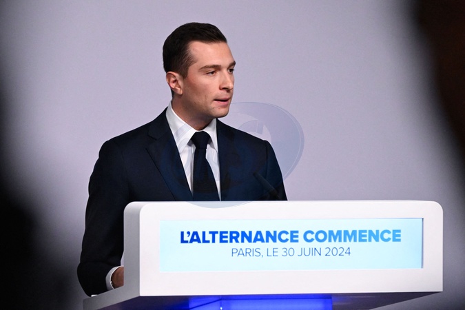Rassemblement national (RN) et principal eurodéputé, Jordan Bardella, prononce un discours lors de la soirée de résultats du premier tour des élections législatives à Paris le 30 juin 2024. L'extrême droite française a remporté le premier tour des élections législatives cruciales du 30 juin 2024, les forces centristes du président français n'arrivant qu'en troisième position derrière la gauche après le taux de participation le plus élevé depuis plus de quatre décennies, selon les estimations. French far-right Rassemblement National (RN) political party President and lead MEP Jordan Bardella gives a speech during the results evening of the first round of the parliamentary elections in Paris on June 30, 2024. France's far right won the first round of pivotal legislative elections on June 30, 2024, with the centrist forces of France's President coming in only third behind the left after the highest turnout in over four decades, estimates said.