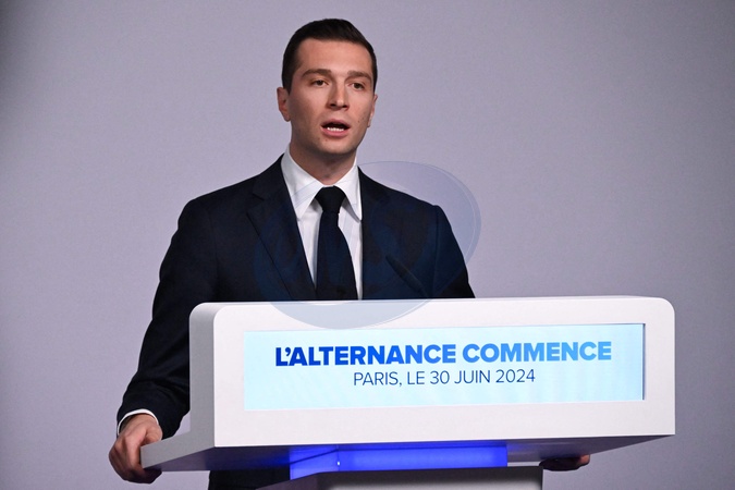 Rassemblement national (RN) et principal eurodéputé, Jordan Bardella, prononce un discours lors de la soirée de résultats du premier tour des élections législatives à Paris le 30 juin 2024. L'extrême droite française a remporté le premier tour des élections législatives cruciales du 30 juin 2024, les forces centristes du président français n'arrivant qu'en troisième position derrière la gauche après le taux de participation le plus élevé depuis plus de quatre décennies, selon les estimations. French far-right Rassemblement National (RN) political party President and lead MEP Jordan Bardella gives a speech during the results evening of the first round of the parliamentary elections in Paris on June 30, 2024. France's far right won the first round of pivotal legislative elections on June 30, 2024, with the centrist forces of France's President coming in only third behind the left after the highest turnout in over four decades, estimates said.