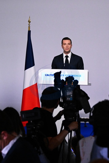 Rassemblement national (RN) et principal eurodéputé, Jordan Bardella, prononce un discours lors de la soirée de résultats du premier tour des élections législatives à Paris le 30 juin 2024. L'extrême droite française a remporté le premier tour des élections législatives cruciales du 30 juin 2024, les forces centristes du président français n'arrivant qu'en troisième position derrière la gauche après le taux de participation le plus élevé depuis plus de quatre décennies, selon les estimations. French far-right Rassemblement National (RN) political party President and lead MEP Jordan Bardella gives a speech during the results evening of the first round of the parliamentary elections in Paris on June 30, 2024. France's far right won the first round of pivotal legislative elections on June 30, 2024, with the centrist forces of France's President coming in only third behind the left after the highest turnout in over four decades, estimates said.