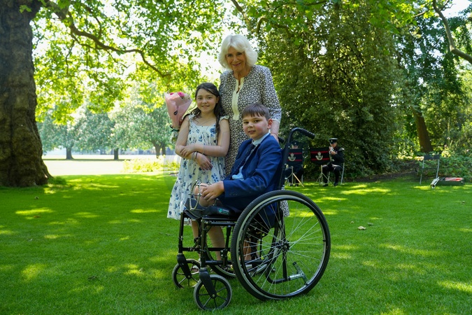 EMBARGOED TO 0001 MONDAY JULY 1Handout photo issued by Buckingham Palace of Queen Camilla with Tony Hudgell, from West Malling in Kent, and Lyla O'Donovan from Catterick, during a private tea party in the gardens Summer House at Buckingham Palace, London, hosted by the Queen on Wednesday June 26. NOTE TO EDITORS: This handout photo may only be used in for editorial reporting purposes for the contemporaneous illustration of events, things or the people in the image or facts mentioned in the caption. Reuse of the picture may require further permission from the copyright holder., Credit:Buckingham Palace / Avalon