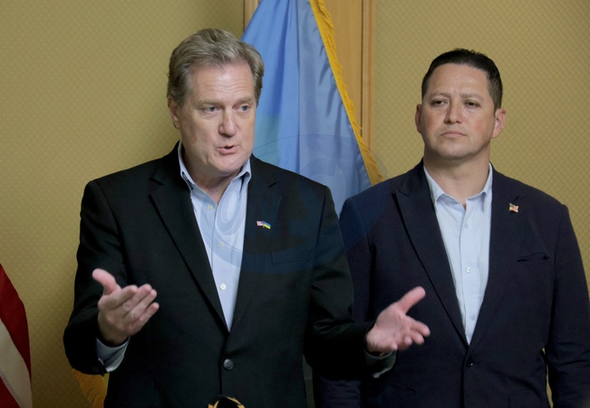 KYIV, UKRAINE - JULY 1, 2024 - Chairman of the House Permanent Select Committee on Intelligence Mike Turner (L) and US Congressman Tony Gonzales attend a briefing during the visit of the bipartisan delegation from the US House of Representatives, Kyiv, capital of Ukraine., Credit:Eugen Kotenko / Avalon