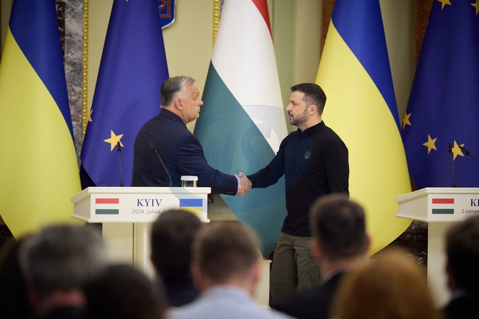Le président ukrainien Volodymyr Zelensky reçoit le Premier ministre hongrois Viktor Orban à Kiev, Ukraine, le 2 juillet 2024. Sa visite a eu lieu immédiatement après le début de la présidence hongroise de l'UE. © Ukraine Presidency via Bestimage President of Ukraine Volodymyr Zelenskyy met with Prime Minister of Hungary Viktor Orbán in Kyiv, Ukraine, on July 2, 2024. His visit took place immediately after the start of Hungary's EU presidency.