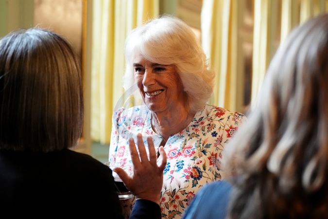 Edinburgh, Scotland, 2 July 2024: Queen Camilla (centre) speaks with guest at a celebration for those who promote Scottish Literacy at the Palace of Holyroodhouse in Edinburgh, including book shop owners and authors, and representatives from the Edinburgh International Book Festival and the Scottish Book Trust., Credit:Andrew Milligan / Avalon