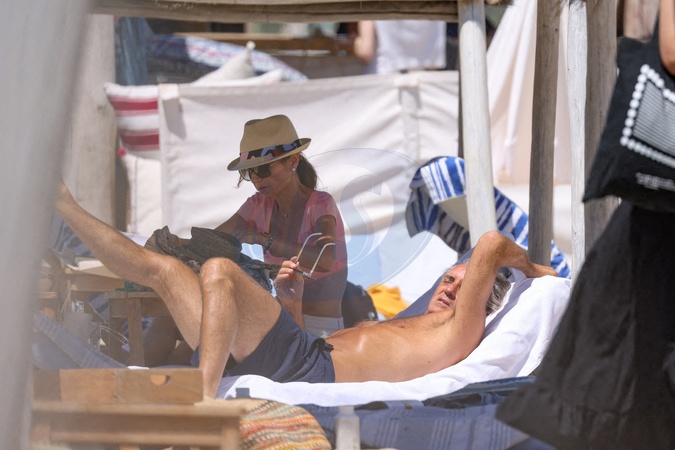 Exclusif - Roberto Mancini, sélectionneur de l'équipe de football d'Arabie Saoudite, se détend avec sa compagne à la plage du Club 55 à Saint-Tropez le 2 juillet 2024. Exclusive - No Web en Suisse / Belgique Roberto Mancini, coach of the Saudi Arabian football team, relaxes with his girlfriend on the beach at Club 55 in Saint-Tropez on 2 July 2024.