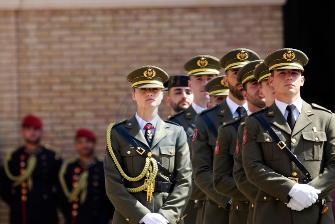 Le roi Felipe VI et la reine Letizia d’Espagne, et la princesse Leonor, lors de la cérémonie de remise des médailles à la nouvelle classe des sous-officiers de l'armée et de la Garde civile à Zaragoza