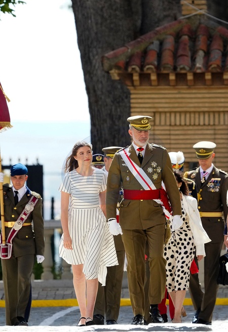 Król Felipe VI i królowa Hiszpanii Letizia oraz księżniczka Leonor podczas ceremonii wręczenia medali dla nowej klasy podoficerów Armii i Gwardii Cywilnej w Saragossie