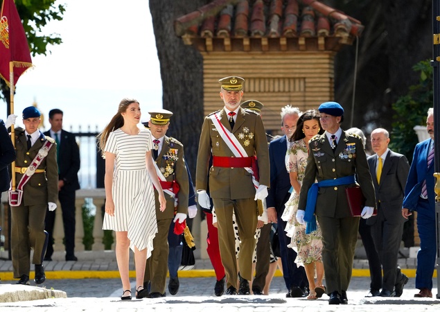 Le roi Felipe VI et la reine Letizia d’Espagne, et la princesse Leonor, lors de la cérémonie de remise des médailles à la nouvelle classe des sous-officiers de l'armée et de la Garde civile à Zaragoza