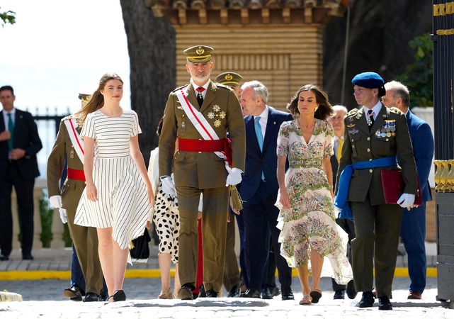 Le roi Felipe VI et la reine Letizia d’Espagne, et la princesse Leonor, lors de la cérémonie de remise des médailles à la nouvelle classe des sous-officiers de l'armée et de la Garde civile à Zaragoza