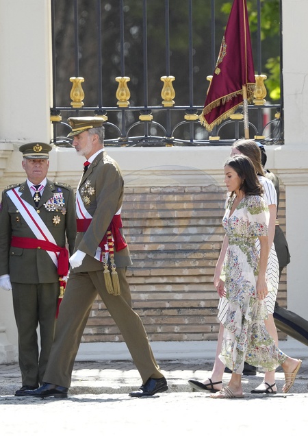 Le roi Felipe VI et la reine Letizia d'Espagne, et la princesse Leonor, lors de la cérémonie de remise des médailles à la nouvelle classe des sous-officiers de l'armée et de la Garde civile à Zaragoza, le 3 juillet 2024. King Felipe VI, Queen Letizia , Crown Princess Leonor and Princess Sofia attend the Delivery of Royal Dispatches of Employment at Zaragoza Military Academy. Crown Princess Leonor received the Grand Cross of Military Merit with white badge and has been appointed Student Ensign by her father, King Felipe VI. Zaragoza - July 3, 2024