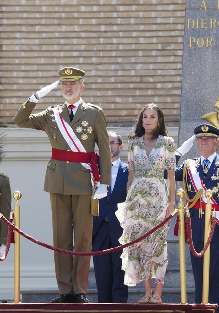 Le roi Felipe VI et la reine Letizia d’Espagne, et la princesse Leonor, lors de la cérémonie de remise des médailles à la nouvelle classe des sous-officiers de l'armée et de la Garde civile à Zaragoza